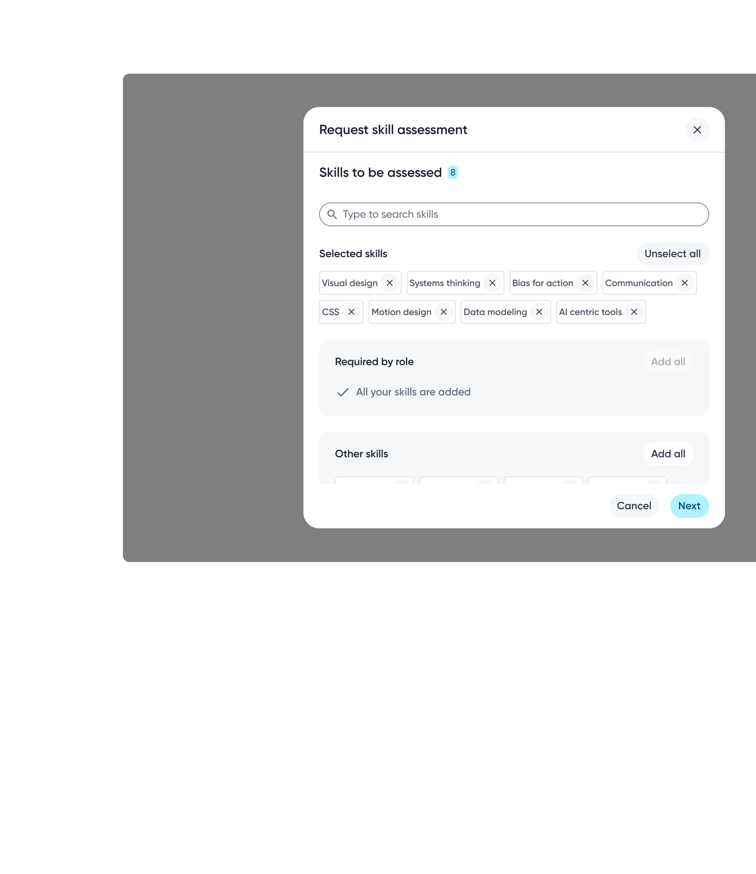 Employees can choose specific skills or include all skills when requesting assessments, depending on the level of feedback wanted.