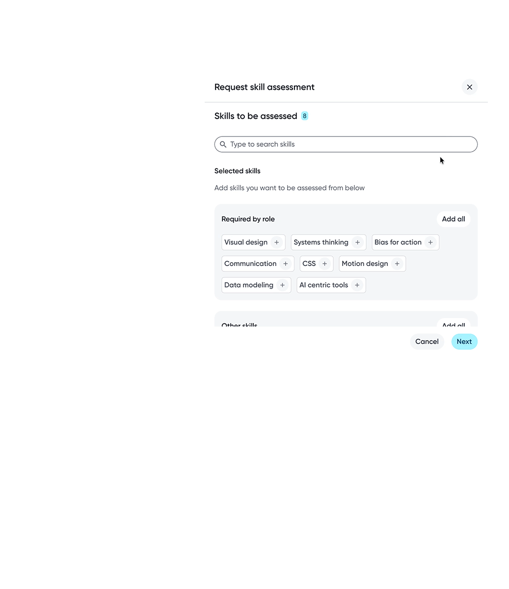 Skills are shaped through collaboration. Supporting peer assessments and flexible assessor selection allows skill data to capture diverse perspectives and reflect how skills are experienced in real work.