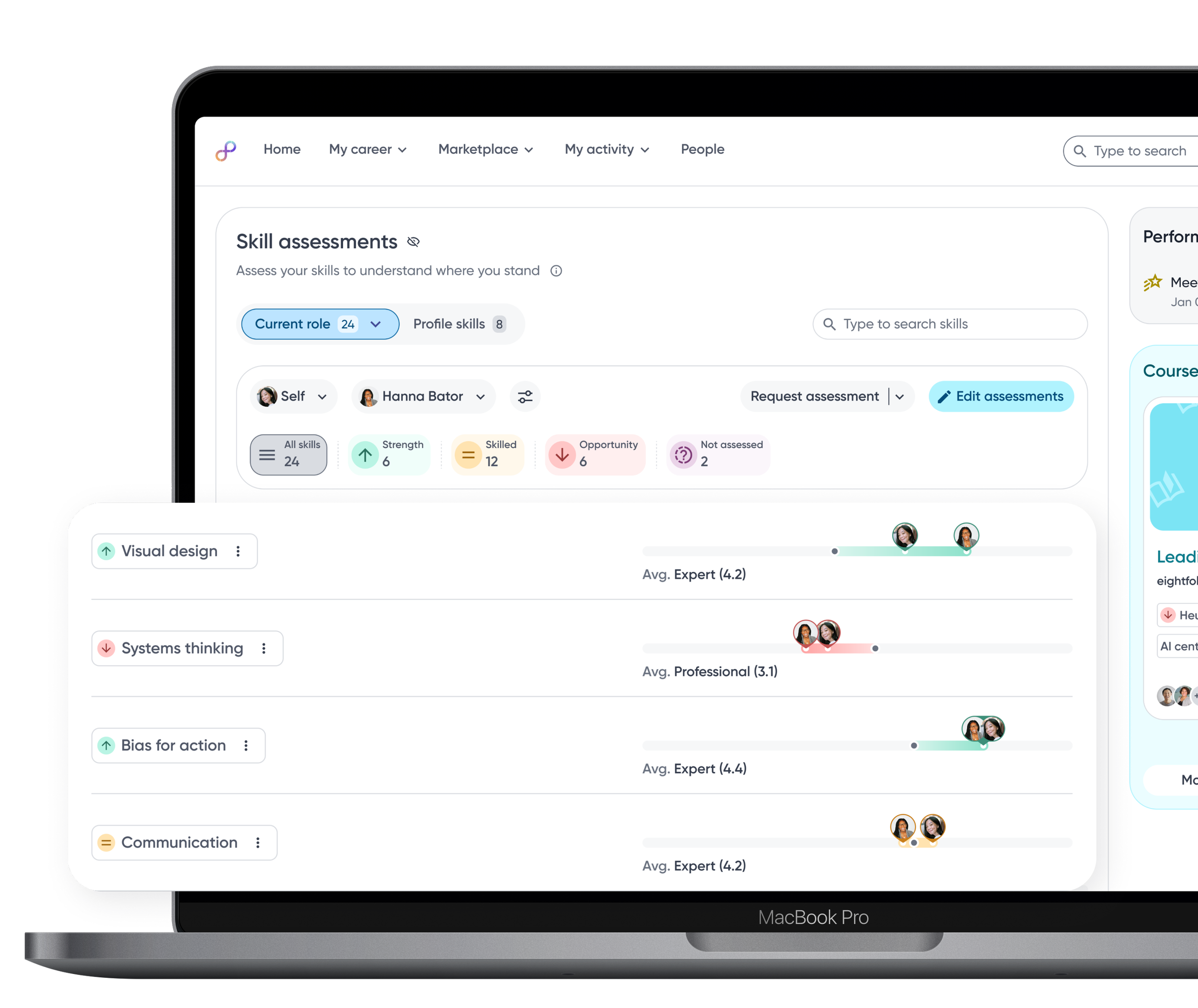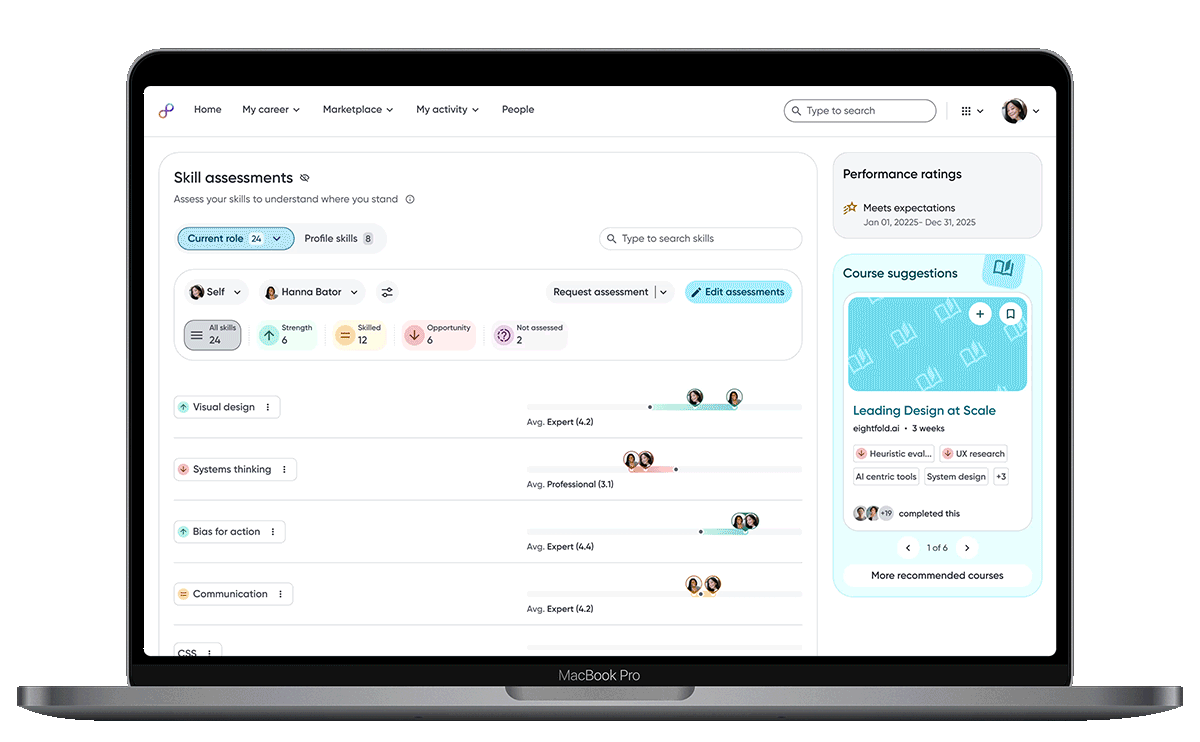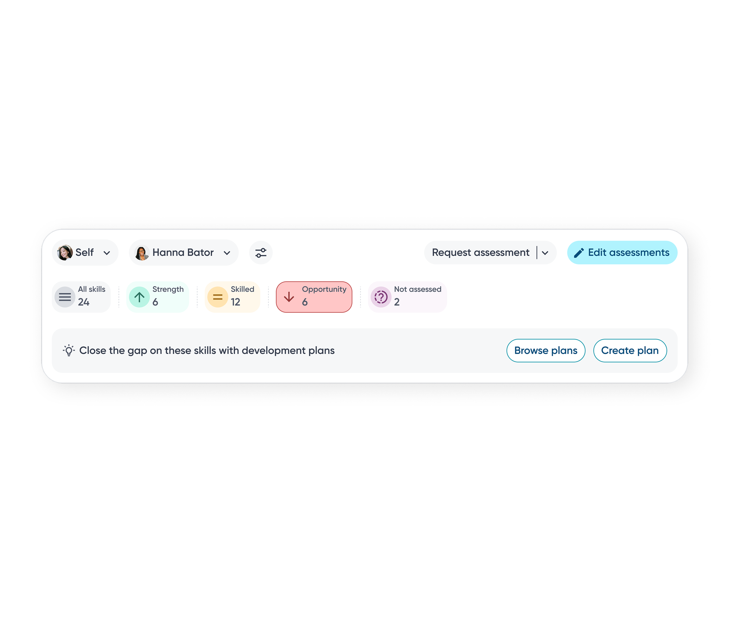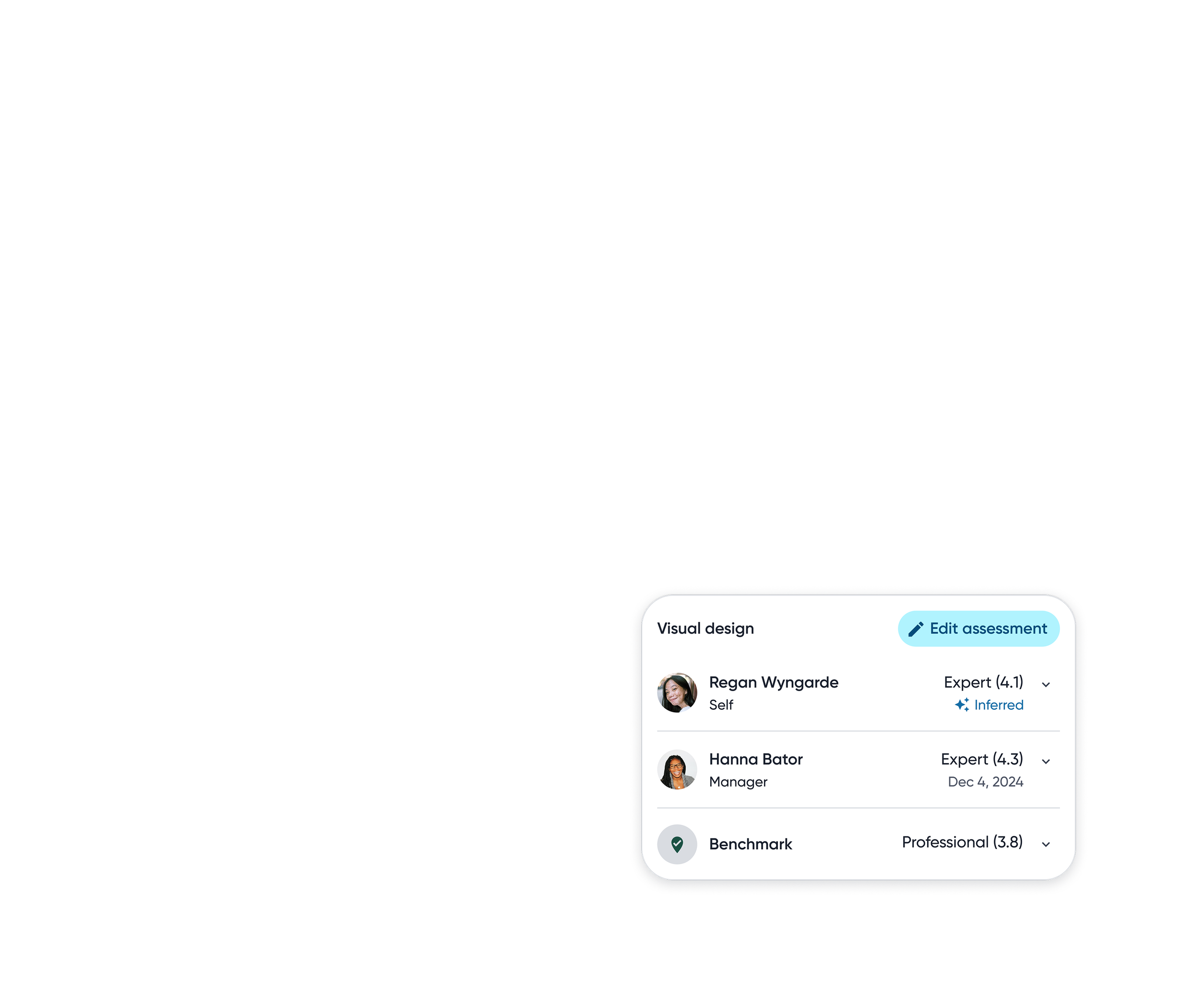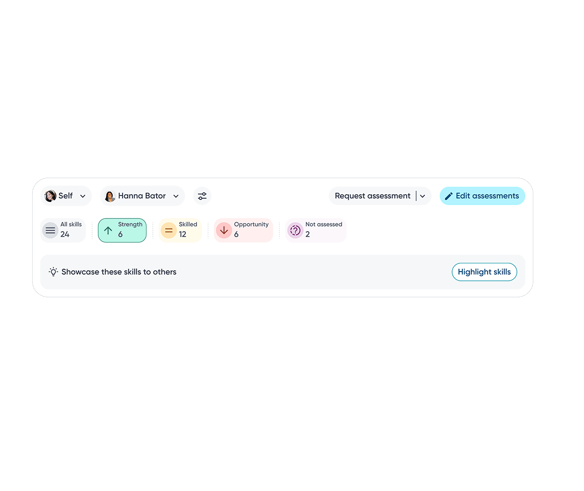 Employees can switch between assessors to view skill proficiency from multiple perspectives, helping them understand context, differences, and potential blind spots.