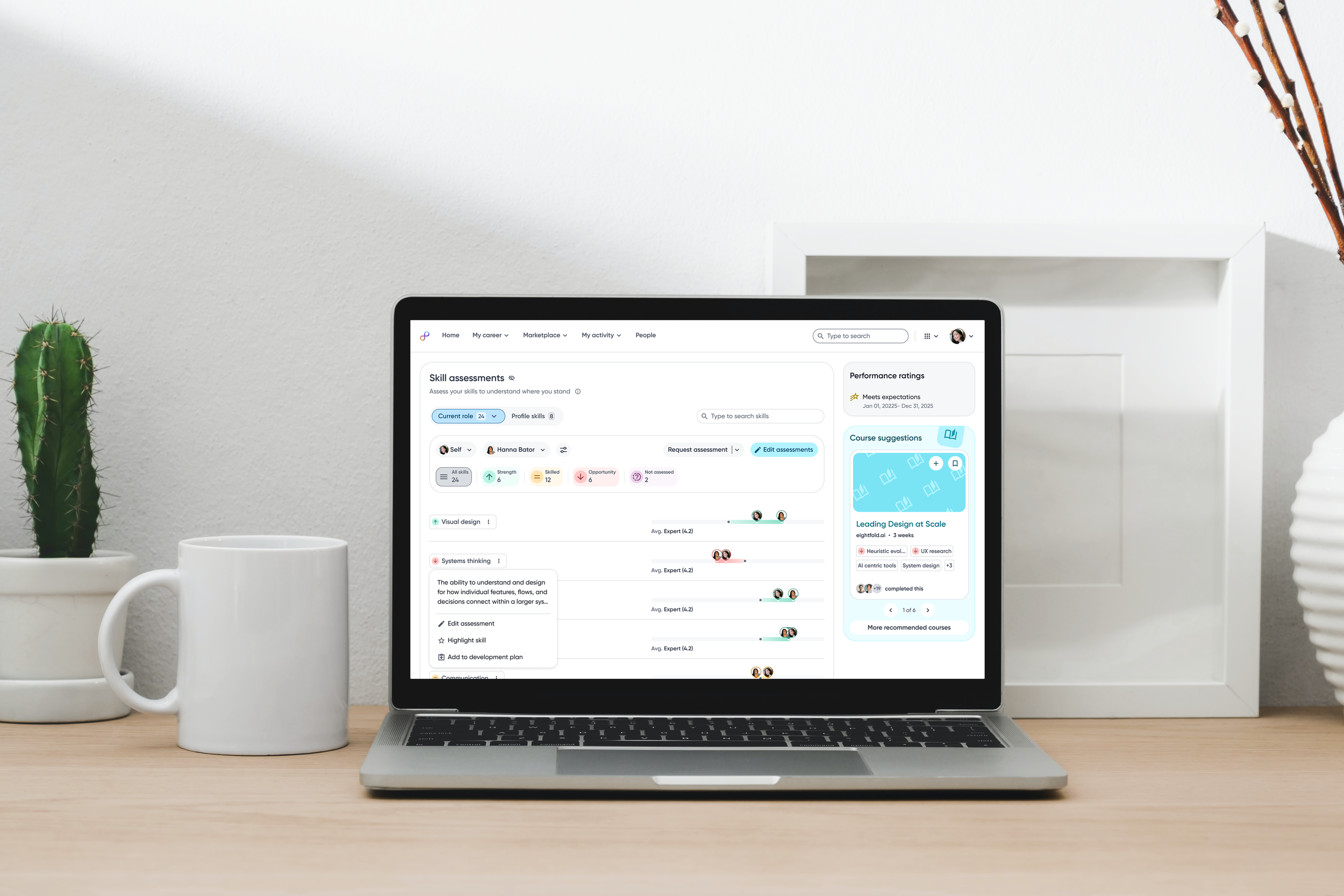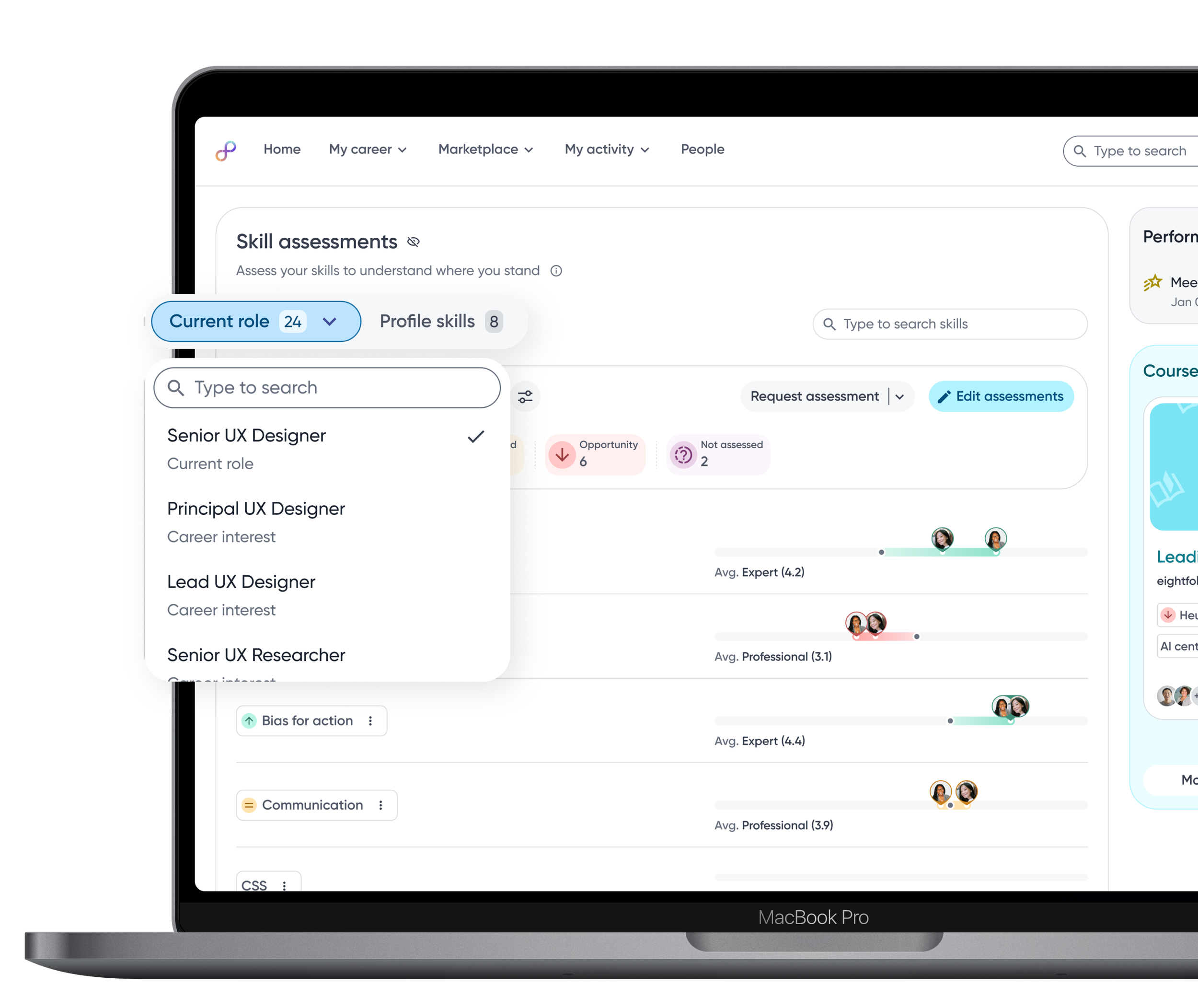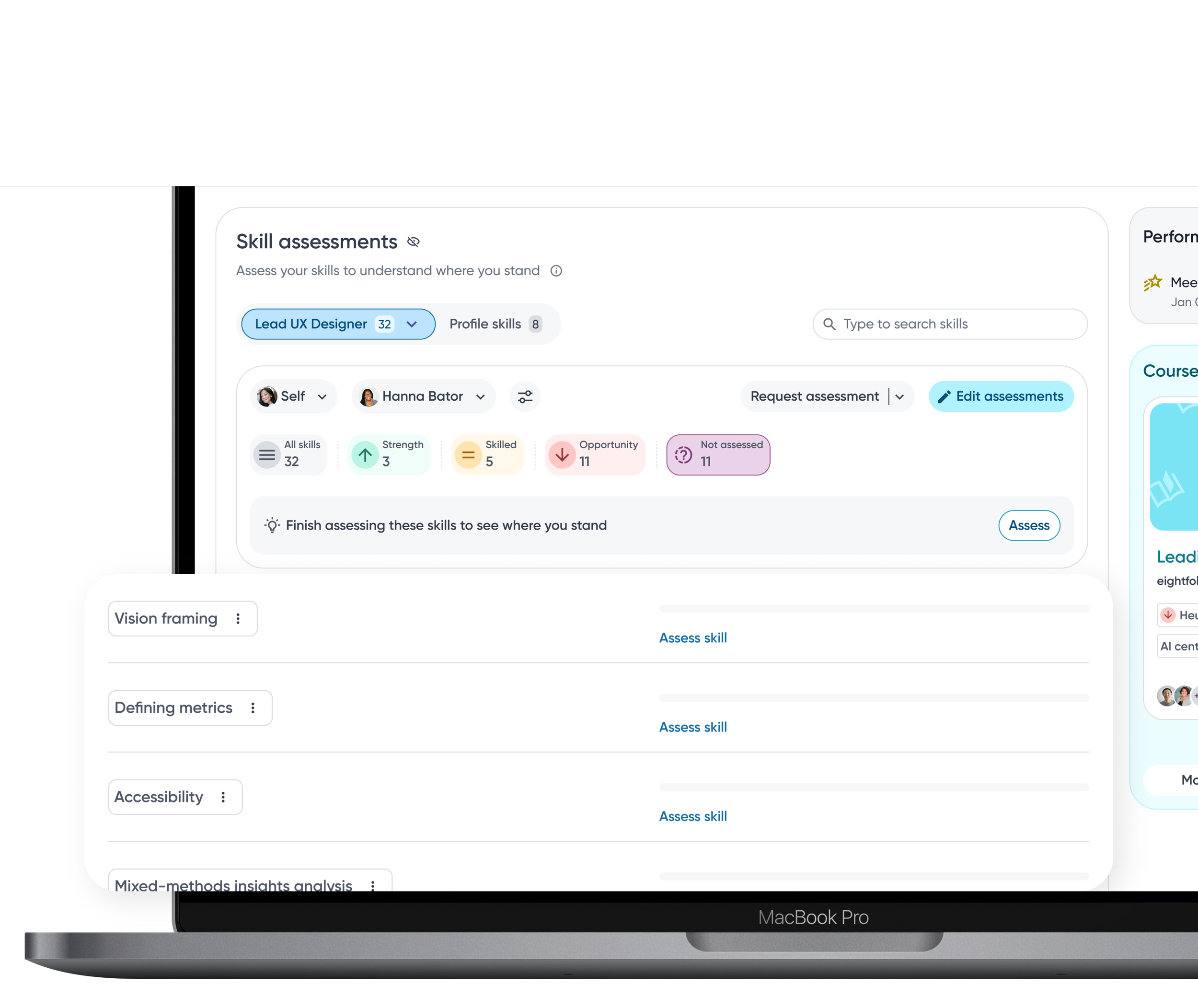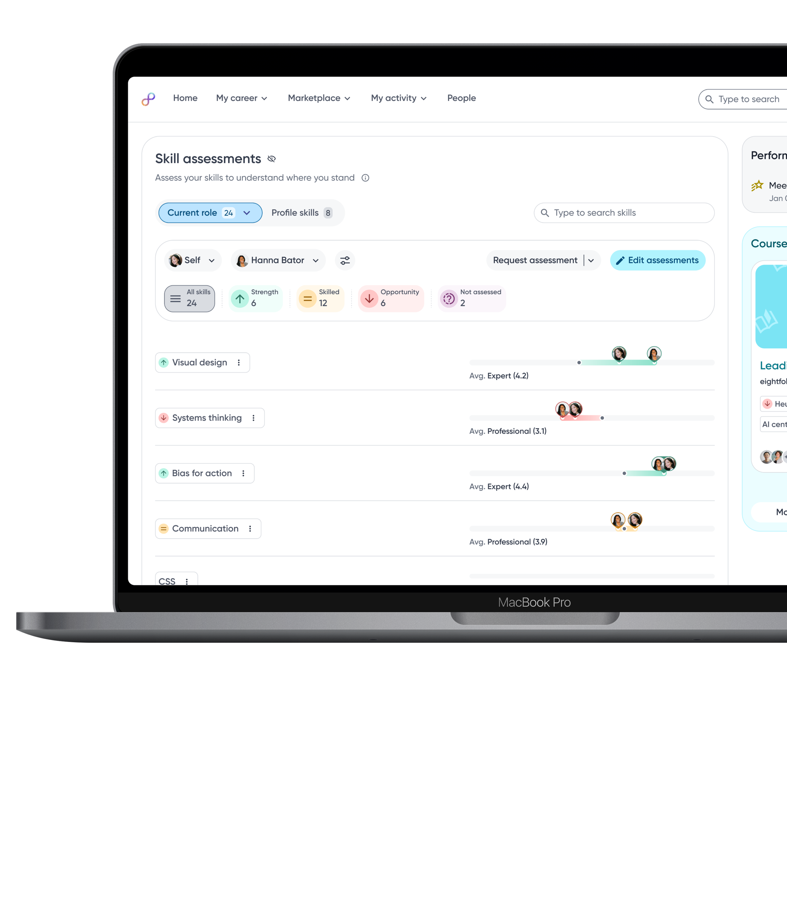 Employees can switch between assessors to view skill proficiency from multiple perspectives, helping them understand context, differences, and potential blind spots.