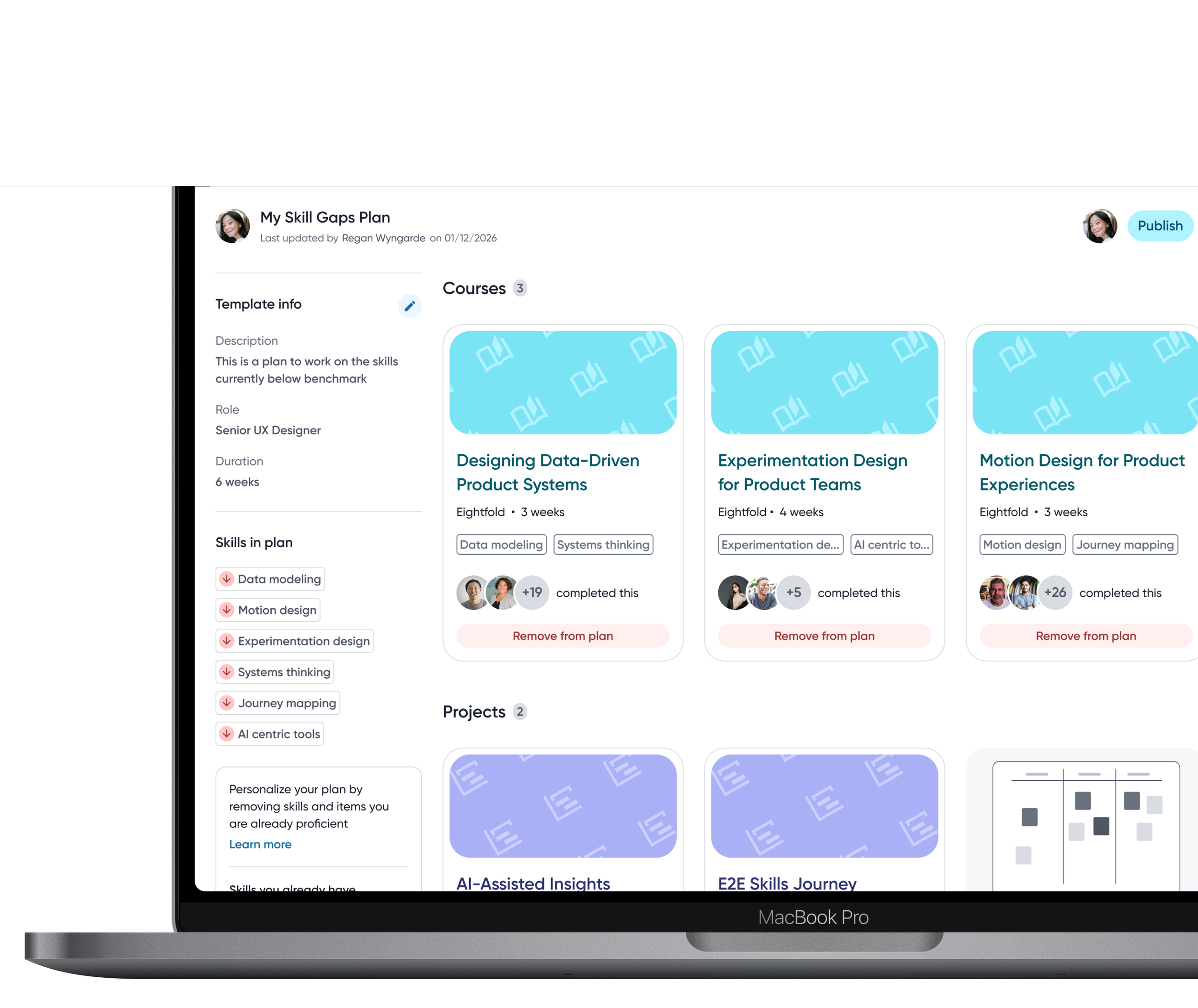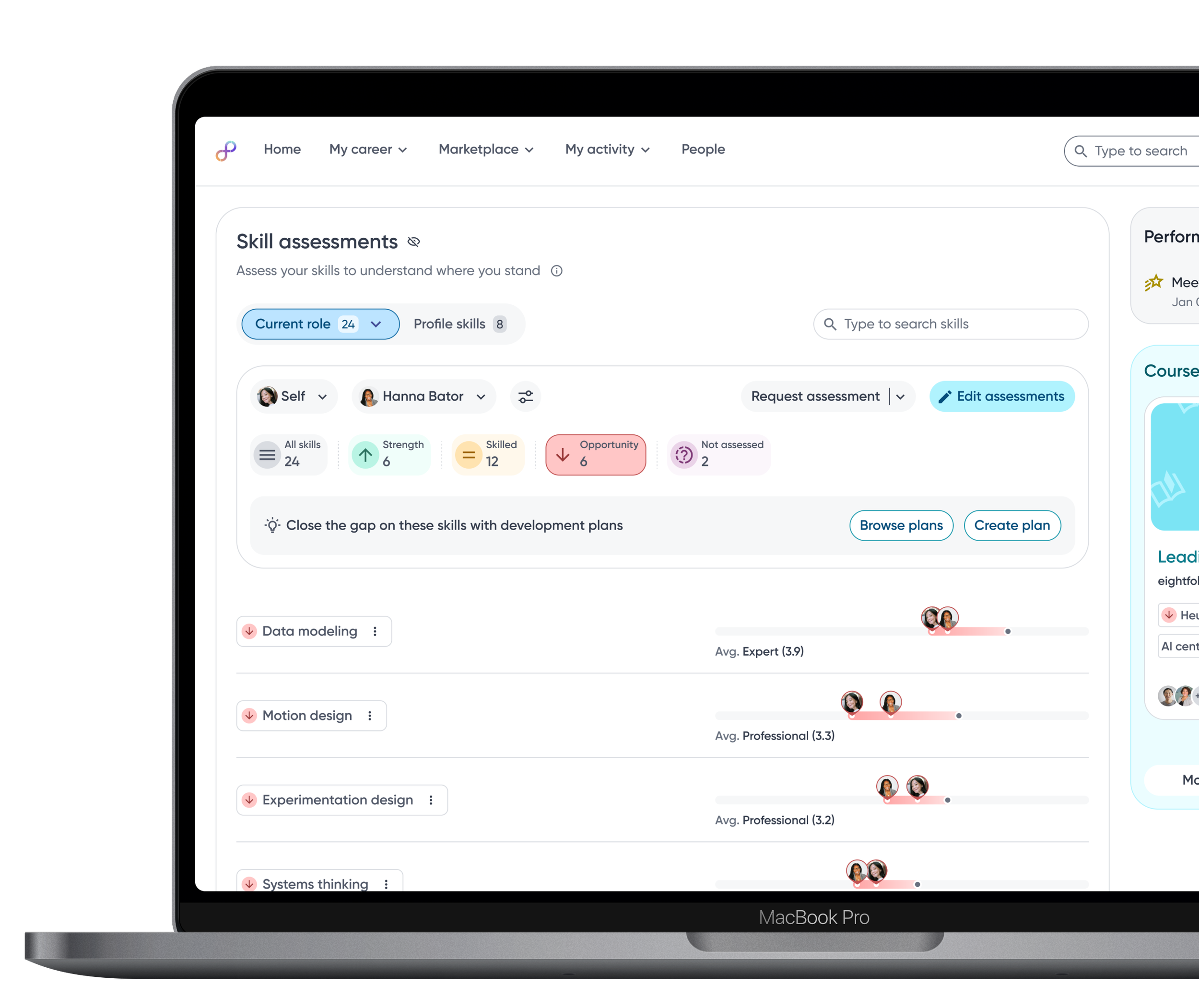 Employees can close the loop on skill gaps by adding them directly into development plans and receiving recommended courses or projects to close the gap.